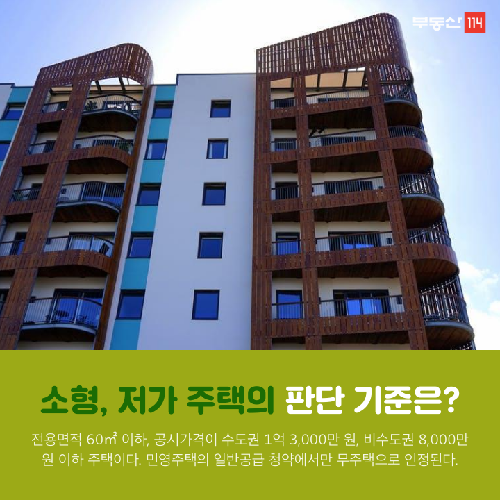 A ¼ÒÇü·Àú°¡ ÁÖÅÃÀº Àü¿ë¸éÀû 60§³ ÀÌÇÏÀ̸ç, °ø½Ã°¡°ÝÀÌ ¼öµµ±Ç 1¾ï 3,000¸¸ ¿ø, ºñ¼öµµ±Ç 8,000¸¸ ¿ø ÀÌÇÏ ÁÖÅÃÀ» ¸»ÇÑ´Ù. ¹Î¿µÁÖÅÃÀÇ ÀϹݰø±Þ û¾à¿¡¼¸¸ ¹«ÁÖÅÃÀ¸·Î ÀÎÁ¤µÇ°í, Ưº°°ø±Þ û¾à¿¡ ¼´Â À¯ÁÖÅÃÀÚ¿¡ ÇØ´çµÈ´Ù.